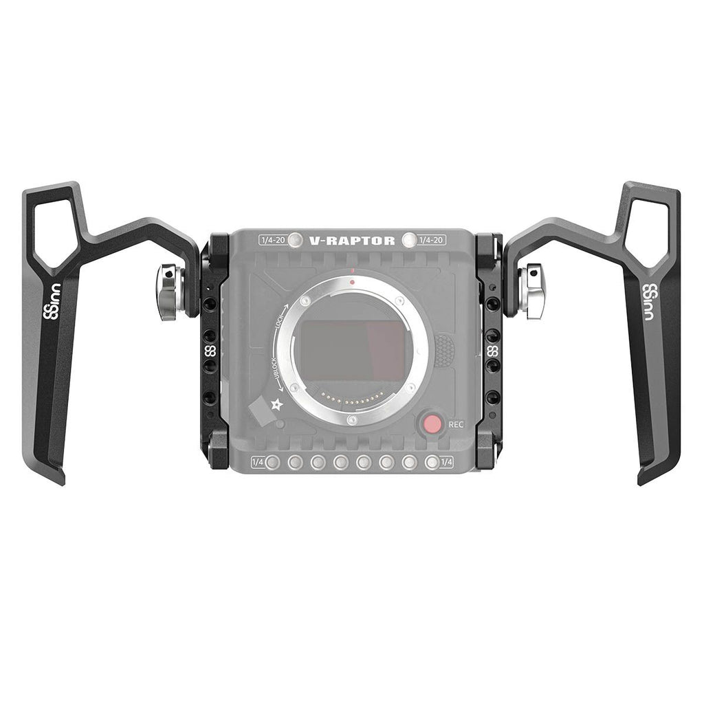 The 8Sinn Black RAVEN Top Handles are attached to both Left & Right Side Plates to allow easy handheld shooting. Each Handle has a built-in Arri standard locating pins with the 3/8" mounting screw in the middle. It guarantees safe and steady handle-to-cage attachment plus adjustment. Besides that, the users can find the usual 1/4" threads on top and the cold shoe mount at the front-top.