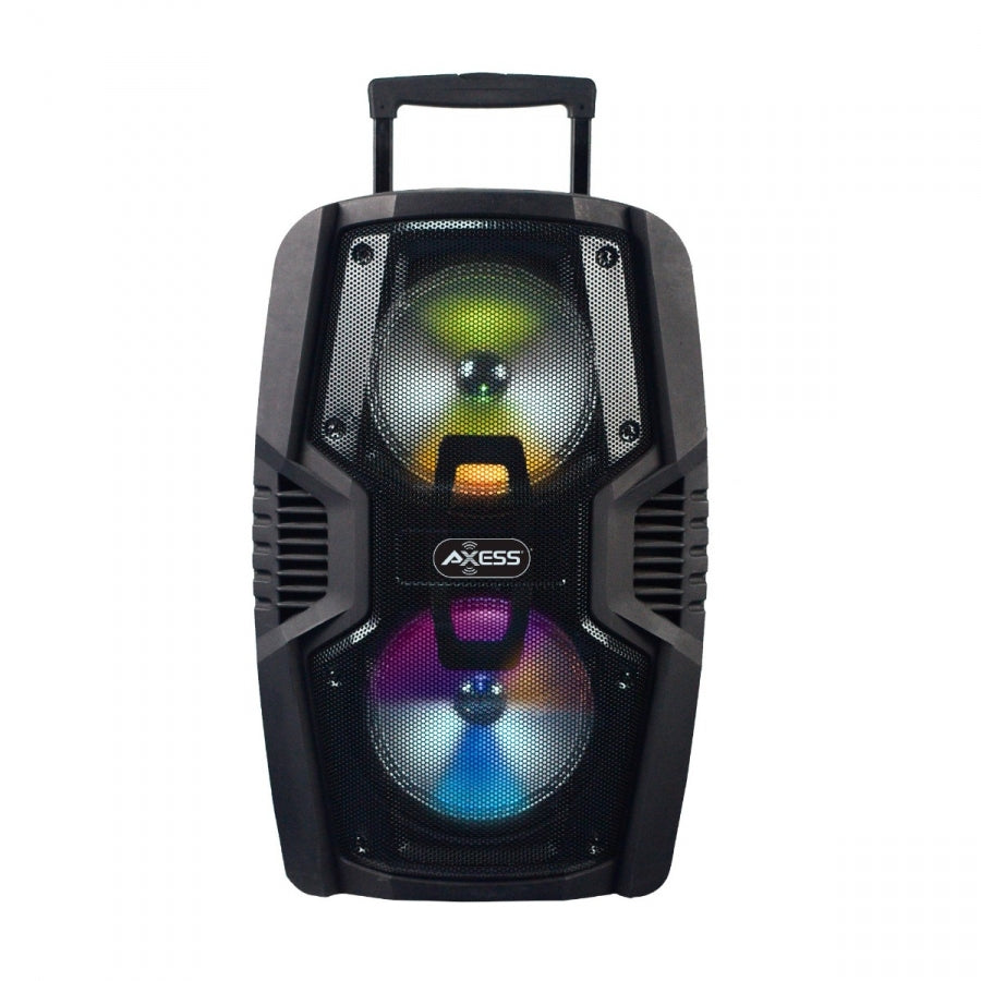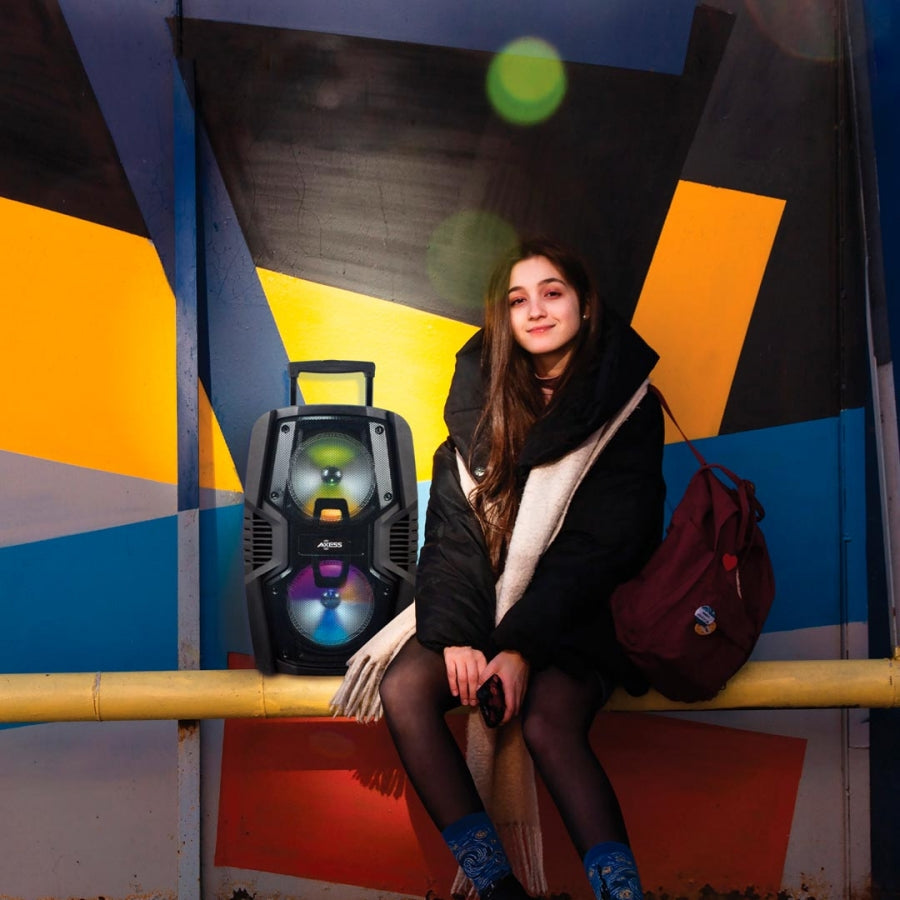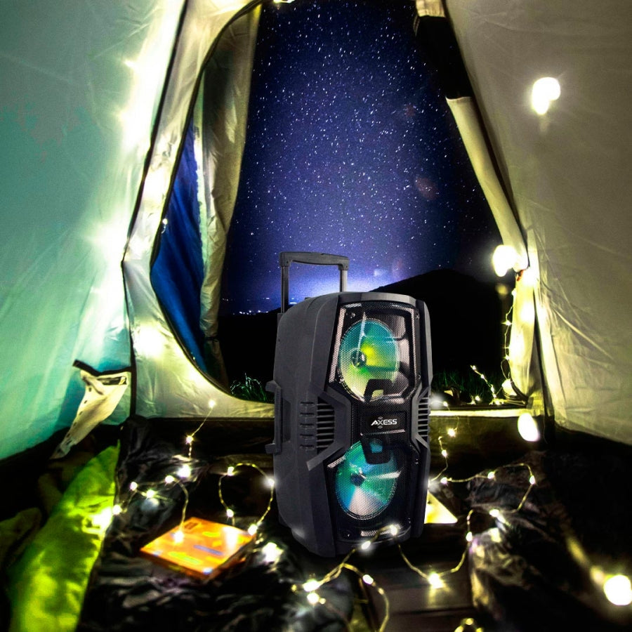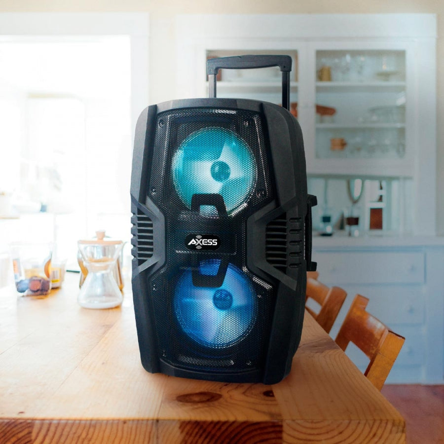 8" Bluetooth® Party Speaker with LED Lights has excellent sound and comes with a Microphone and Remote Control. Built with a retractable handle and sturdy wheels, this purchase is ideal for any outdoor or indoor activity. Just a few examples of what you can do with this model such as a backyard cookout, small group hangout, or workouts at the park. Great for karaoke singing with the speaker's accessories including a wired microphone and full function remote control. There are a few options for how to listen to your music, through a Bluetooth® connection or not-Bluetooth® connection (for instance, the AUX input, USB drive, or TF card slot). On top of being a sturdy built and easy functional speaker, this new Axess 8" Bluetooth® Party Speaker brings the party to any get-together, because of its lively and brilliant LED lights display. |