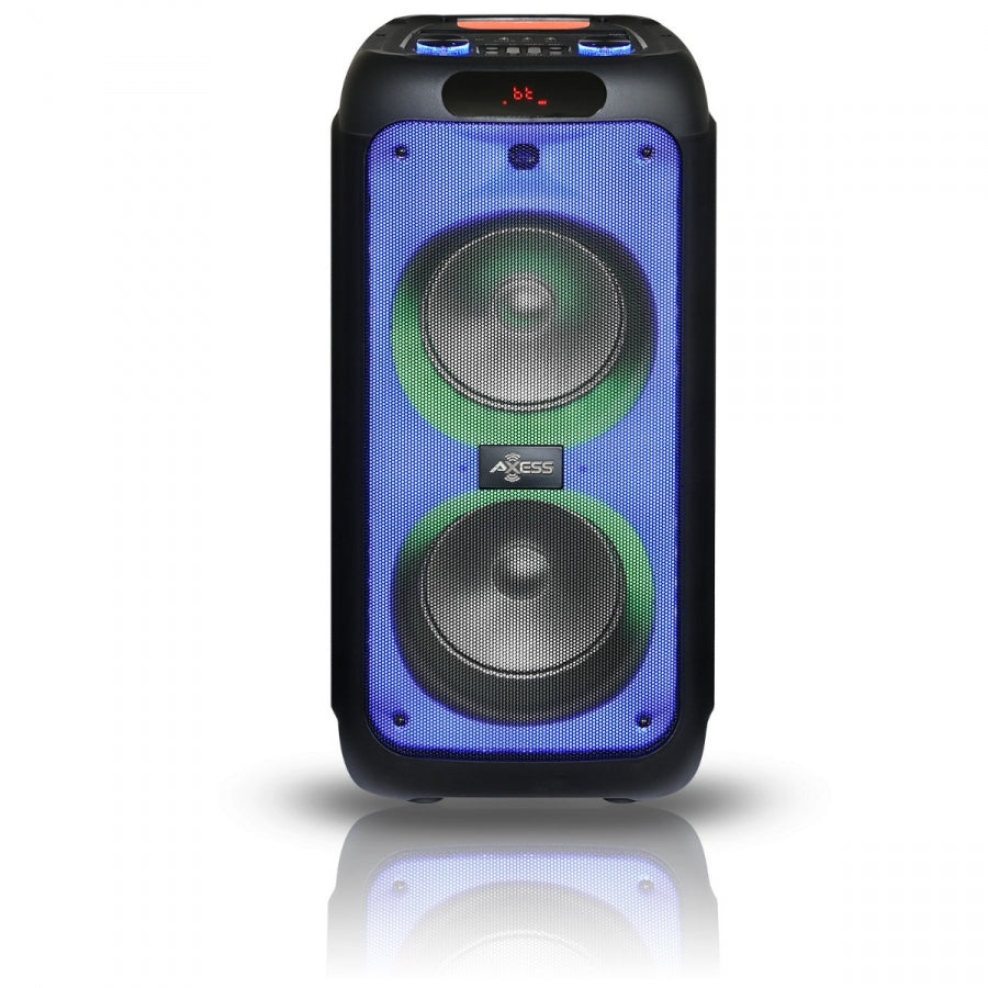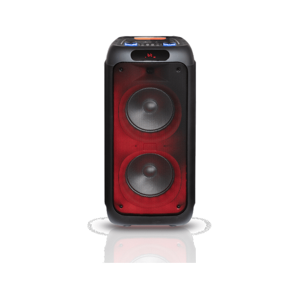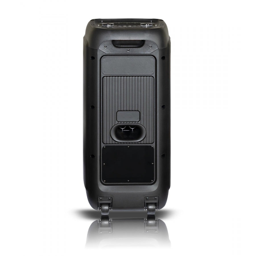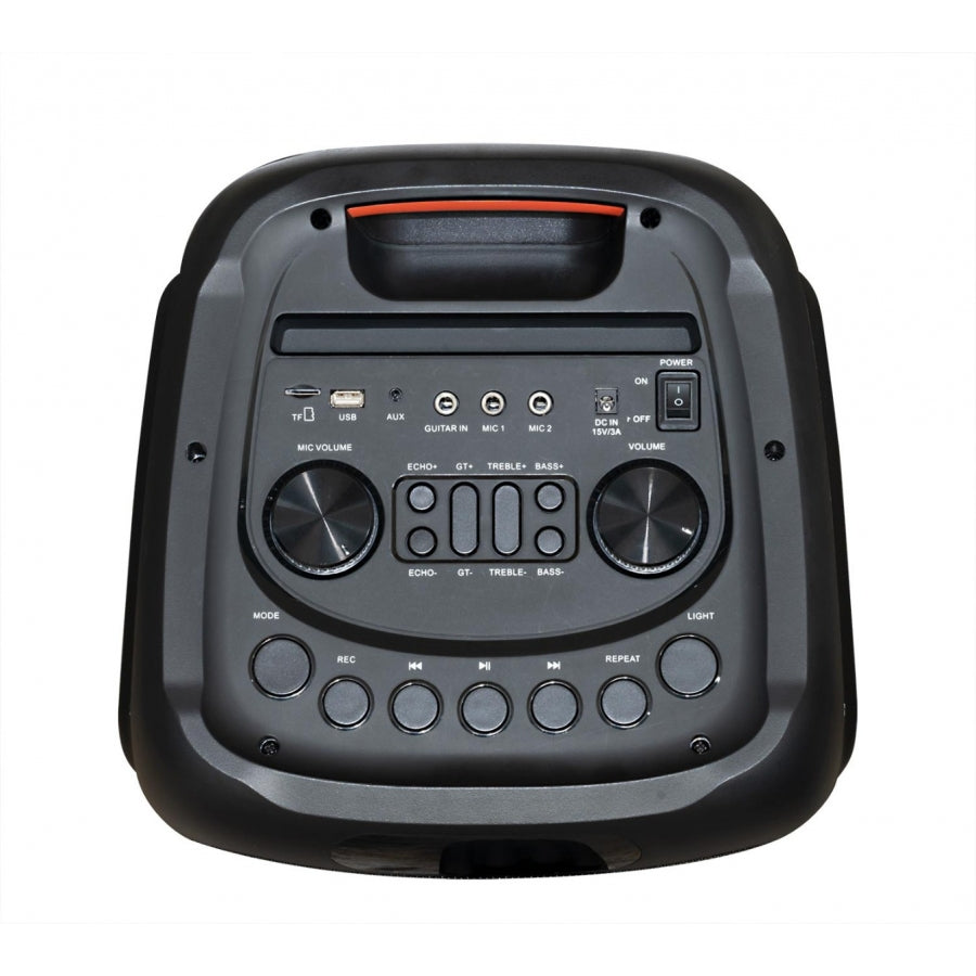 | • Double 8” Woofer + 1.5” Tweeter • New front panel Party Flame Light • LED Screen • USB/TF Card Inputs • FM Radio Function • Two Wired Microphone Input • One Guitar Input • Guitar Volume Adjustment • AUX Input • TWS True Link Connect With Other Units • 60 watt RMS Power (4,000 Watt PMPO) • 12V/7.5 Lithium Battery • Input DC 12V • Bass & Treble Adjustment • Guitar Volume Adjustment • MIC Volume & Echo Adjustment • MIC Delay Adjustment • Repeat & REC Function • ON/OFF & Change Light Style Button • One Large Remote Control • One Wireless Microphone • Adaptor 15V/2A • Handle & Wheels For Easy Transport |