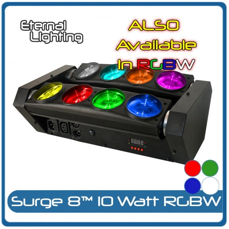 Description: The Surge 8 sweeping LED Beam Effect is an amazing lighting fixture to create lot-o-beams in your nightclub, bar, stage design. You can create chase patterns, pulsing and strobing with the Surge 8. We also offer another variation of this fixture with 10 Watt CREE RGBW LEDs. The two independently moving bars allow you to project very narrow 4 Degree beams through the air. Are you looking for a Wow factor for your Club, Bar, Or Stage Design? Consider adding beam effects with the Eternal Lighting SURGE 8 which has 10 Watt White LEDs. The more fixtures used in a space the more creative you can get with your design. This fixture is also ideal for Mobile entertainers, Bands and DJs. |