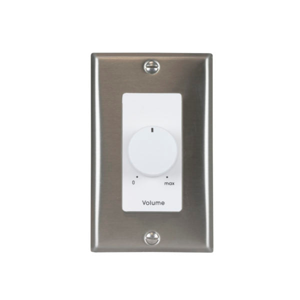 SPECIFICATIONS • Power Rating: 25W • Attenuation: 3dB per step (33dB total) • Use With: 25/70/100V speaker line • Activation: Rotary dial • Volume Positions: 0-10 • Termination: Phoenix-style • Wire Capacity: 14-gauge • Wall Plate: 1-gang decorator style • Finish: Stainless Steel & White • Fits standard E.O. box (2.125 in. min. depth) |