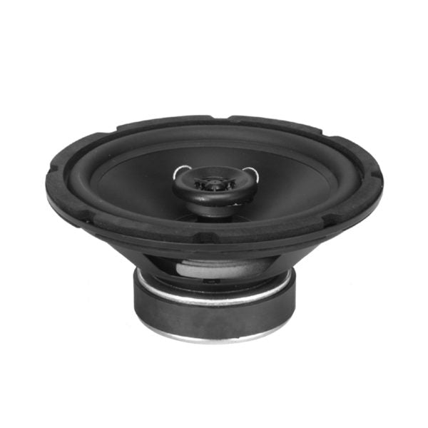 FEATURES • Description: A 20oz. LF magnet coupled with 1.4 inch copper voice coil drive a polyproylene cone with half-roll rubber surround for long cone travel and good edge damping. The post-mounted tweeter is a 1 inch balanced-drive dome protected by Ferrofluid and a first-order high-pass filter. • Frame: Stamped 20-gauge steel with black enamel finish and zinc plated back-plate. • Power Rating: 50W RMS • Frequency Response: 50Hz-20kHz (±7.5dB), crossover at 4kHz • Mounting Depth: 3.85 in. • Mounting Bolt Circle: 7.625–7.688 in. • Dispersion Angle: 90 degrees conical • Average Sensitivity: 89.6dB • Made in U.S.A. with global components • Meets or exceeds industry standards