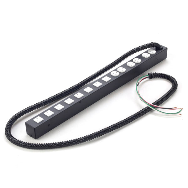 | Power strip with 14 NEMA outlets on two circuits, hardwired with flexible conduit. Includes mixture of 15A and 20A outlets. |