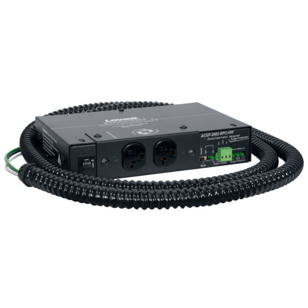 SPECIFICATIONS • Suppresses line to neutral with no ground contamination. • TCR technology defeats surges up to 72,000 amps • Two (20A) NEMA outlets spaced for power supplies. Patented plate rotates 90 degrees for front or side access. • Front LEDs provide visual system status. • Universal mounting brackets allow versatile installation. • 6-ft. non-metallic flexible conduit with pigtail leads for hardwired connection. • Chassis: 1.75 in. x 6 in. x 9 in. • Remote Power Control (RPC) capability by a low voltage sequencer, switch or control system that provides a maintained dry contact closure. • 10 year warranty COMPLIANCE & CERTIFICATION • ETL Listed • Conforms to UL1449-4 and ANSI C62.41 A&E SPECIFICATIONS The 20A single-circuit surge protector shall be Lowell model ACSP-2002-RPC-HW with one duplex outlet. It shall protect the line to neutral without ground wire contamination. It shall be capable of protecting electronic equipment from transient voltages, spikes and surges up to 72,000A and have a response time of less than 5 nanoseconds. It shall include mounting brackets, two 20A outlets mounted on a plate that can be rotated 90º for front or side access, LED status indicators and a 6 ft. flexible conduit with pigtail leads. It shall include remote power control capability (by low-voltage sequencer, switch or control system that provides a maintained dry contact closure, not included). It shall be ETL Listed and conform to UL1449-4 and ANSI C62.41. |