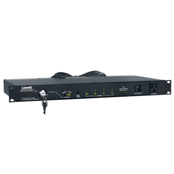 FEATURES • Outlets (9 total): 1 front 15A (un-switched), 2 rear 15A (un-switched) , 6 rear 15A (switched) • Power Rating: 120VAC, 60Hz, 15A • Termination: 9 ft. attached cord with NEMA 5-15P plug • Advanced surge protection to 72,000A. • Four-step sequencer has a delay between steps that can be set between 0.5 and 10 seconds (screwdriver adjustable) • Color coded LED status indicators • Rear terminal block for connection to optional remote switches (momentary) • Rear terminal block to allow system switches to be overridden for life safety system applications where fire code mandates an alarm interface. • Chassis: 19 in. x 9 in. x 1.75 in. (1U) • On/off Switch: Key COMPLIANCE & CERTIFICATION • ETL Listed (U.S., Canada) • Made in U.S.A. with global components • Surge Protector: UL1449 fourth edition and ANSI C62.41 compliant A&E SPECIFICATIONS The 1U rackmount panel with nine 15A power outlets (one un-switched in front, two un-switched in rear, six switched in rear), surge suppressor, and four-step sequencer shall be Lowell Model ACSPR-SEQ4-1509K. It shall be ETL Listed and have a power rating of 120VAC 60Hz/15A with EMI/RFI filtering. The front switch shall sequentially activate and deactivate equipment connected to the “switched” rear outlets in four steps. The sequence delay between steps shall be between 0.5 to 10 seconds, which shall be screwdriver adjustable. Surge suppressor shall be UL1449 fourth edition and ANSI C62.41 compliant to defeat surges up to 72,000A. The steel chassis shall have a black finish and feature color coded LEDs and a key activation switch on the front. Overall measurements shall be 19 in. x 1.75 in. x 9 in. Termination shall be via a 9 ft. cord with NEMA 5-15P plug. |