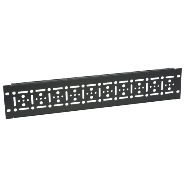 Steel panel with plenty of slots for lacing wires and cables in rackmount applications. |