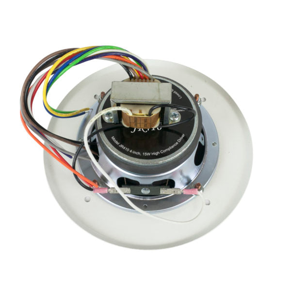 PERFORMANCE • Full fidelity sound, very wide dispersion INCLUDES • Driver (JR410): 4 in. 15W high compliance driver employs 10 oz. ceramic magnet. Cone is paper with treated cloth surround for smooth, extended frequency response and a clean, natural sound. • Transformer (TLM-572): 70V/25V dual-voltage transformer. Taps at 0.25, 0.5, 1, 2, 5W. • Grille (WB-4): Precision-formed steel. 7.25 in. diameter. White. COMPLIANCE & CERTIFICATION • Made in U.S.A. with global components