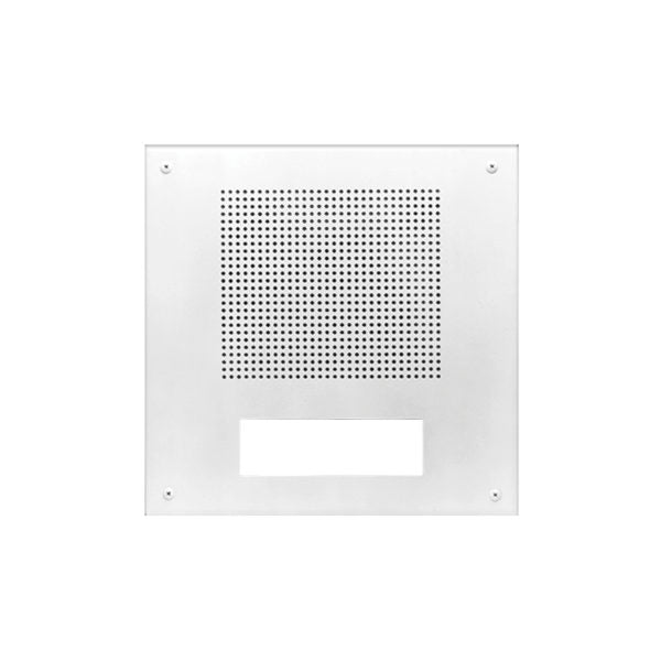 The grille for the digital clock/speaker center shall be Lowell Model __________. It shall be formed from 18-gauge steel with white powder epoxy finish. The grille shall measure 12.69 in. square and feature a rectangular perforation grille, welded studs to mount an 8 inch speaker, and a cutout to accept a digital clock. The speaker, clock, and backbox shall be ordered separately.