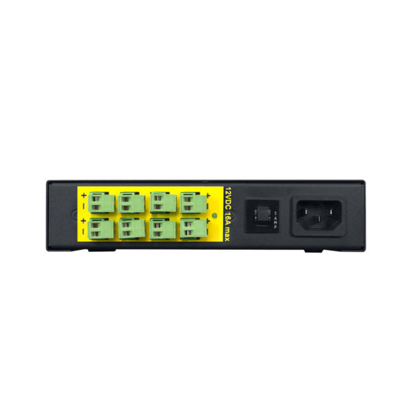 Space saving power distribution unit designed for continuous operation, provides eight voltage outputs. Ideal for DC powered devices and behind-screen use. |