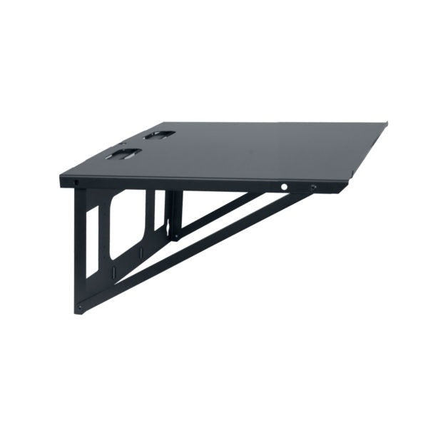 Steel wall shelf folds flat for efficient shipping and convenient warehousing, then unfolds to the service position for quick installation with flanges that insert into rear panel cutouts. Mounts with equipment platform up or down.