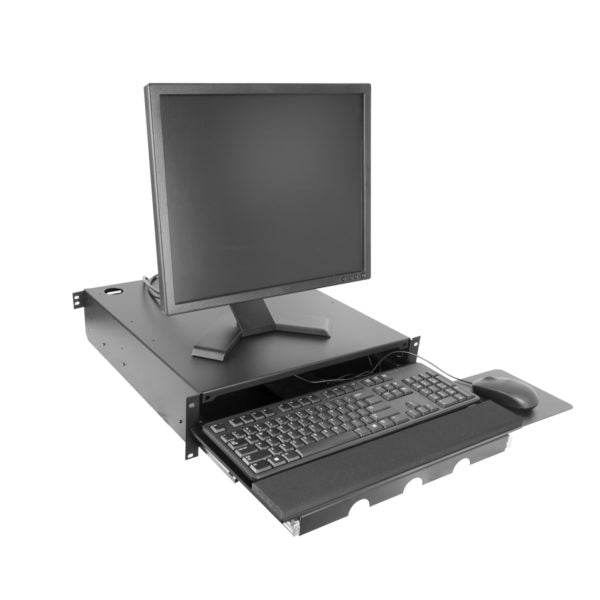 Reinforced rack mount shelf can support a standard computer monitor, extended keyboard and mouse. The 16 in. forward extension is engineered for racks with minimum depth of 27 in. |