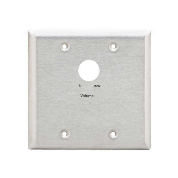 Stainless steel wall plate is made to retrofit a 1-gang key lock control to a 2-gang box.
