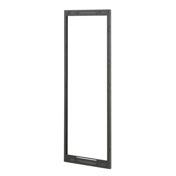 The dual door frame is made to fit most Lowell racks (23 in.). Use the frame to mount a single short door in order to secure some of the mounted equipment. Alternately, you can mount two short doors to the same rack and change the key lock on one of them to control access to equipment.