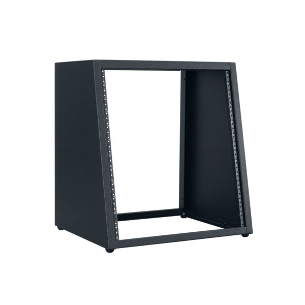 The desktop rack features a sloped front for easy viewing of equipment and controls from a seated position. Includes rubber feet. |