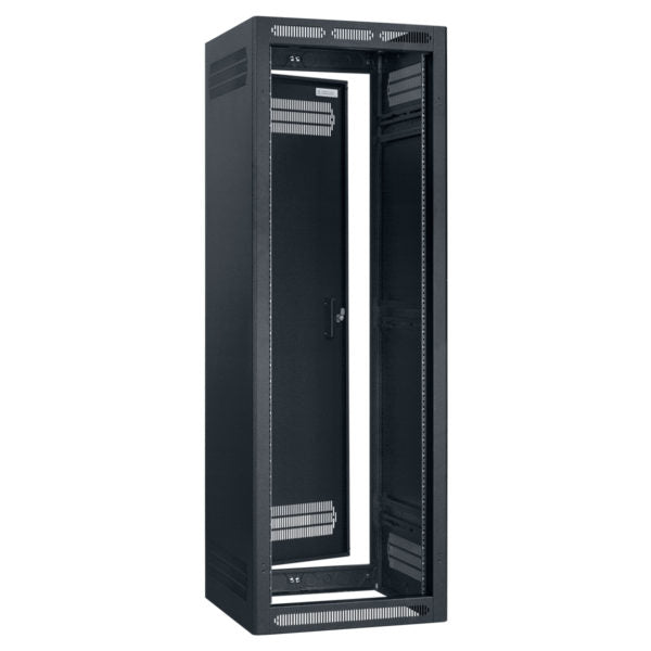 35U x 27"D stand-alone floor rack with adjustable rails is fully welded 16-gauge steel with 14-gauge base, reinforced at all load-bearing junctions. |