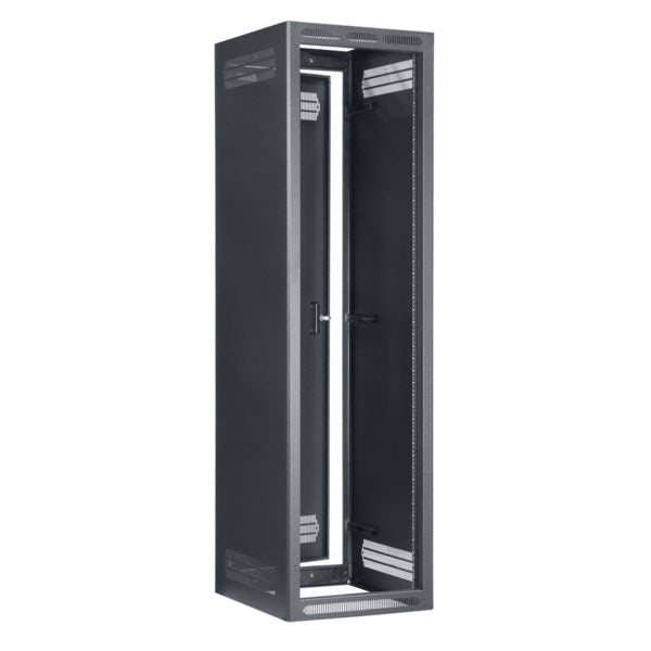 44U x 27"D 19-inch equipment rack with fixed-position front rails features welded sides and short rear brackets for semi-adjustable placement of accessories in the rear. Fully welded 16-gauge steel with 14-gauge base, reinforced at all load-bearing junctions. |