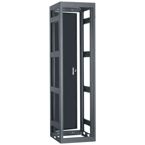 44U x 27"D Gangable rack with adjustable rails is fully welded 16-gauge steel with 14-gauge base, reinforced at all load-bearing junctions. |