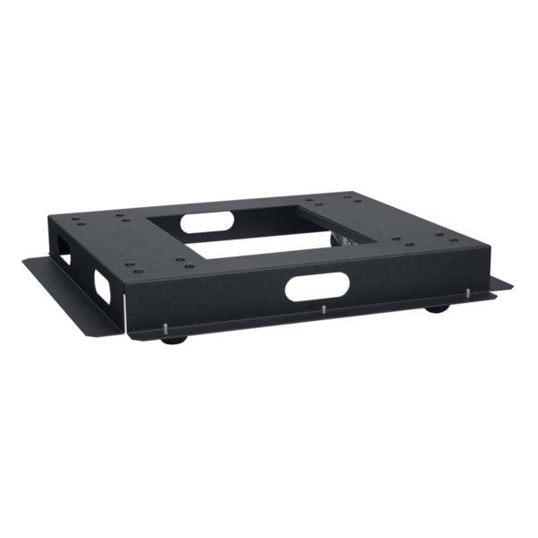 • The rack's mobile base shall be Lowell Model ________, which shall be of an inner platform design that mounts inside the rack frame, adding a floor positioned flush to bottom rack space. Construction shall be 14-gauge welded steel with a center opening and black wrinkle powder epoxy finish. Side openings for cable pass-through. Four heavy-duty (3 in.) non-locking swivel casters shall be positioned inside the platform providing a total load rating of 1400 lbs. Increase in overall rack height shall be 1.25 inches. Mounting hardware shall be included.