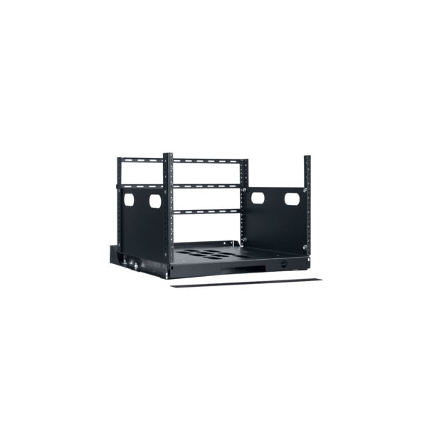 Pull out rack for use in cabinets or custom millwork. The top section of the rack slides forward to access mounted electronics. |
