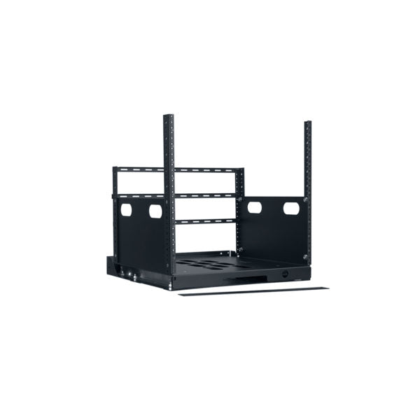 Pull out rack (slide out rack) for use in cabinets or custom millwork, the top section of the rack slides forward to access mounted electronics. |