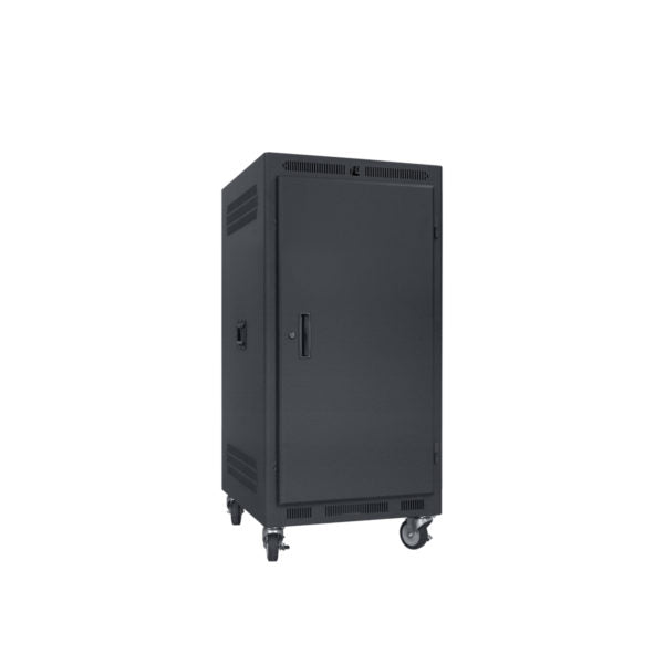 | Mobile security rack for educational, institutional or professional settings is 16-gauge steel construction with 14-gauge steel base reinforced at all load-bearing junctions. Solid steel door with key lock. |