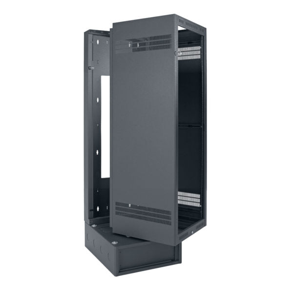 Wall-mount rack swings open with a single-release grasp and pivots smoothly on internal spring-loaded hinges and stainless steel ball transfers set into the base, which adds an additional 4U to load capacity. Slam latch closure. |
