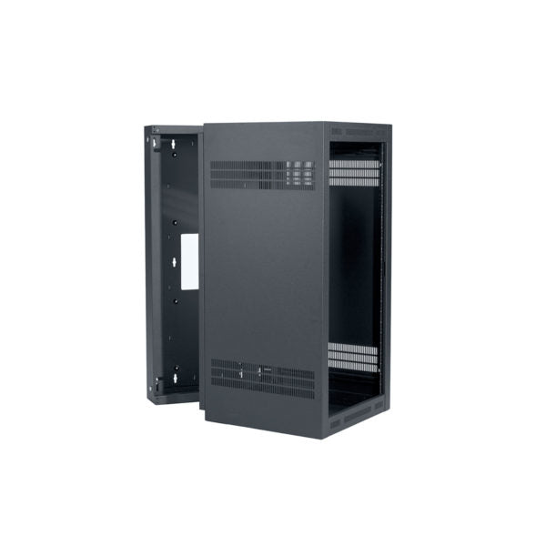 | Heavy duty sectional wall rack features a front section that swings open to access wires and equipment. |