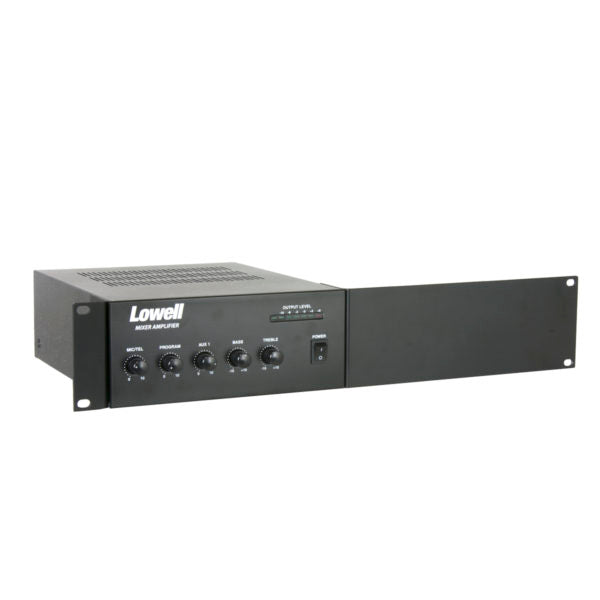 | Mixer and 30W power amplifier with 4 ohms, 8 ohms, 25V and 70V speaker outputs at screw terminals. Includes brackets to mount to a 19 in. rack. |