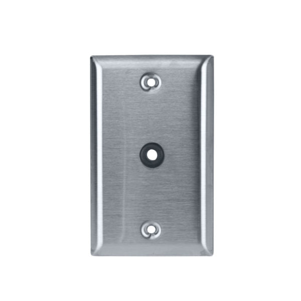 | One-gang stainless steel wall plate with center hole punched for a microphone, not included. |