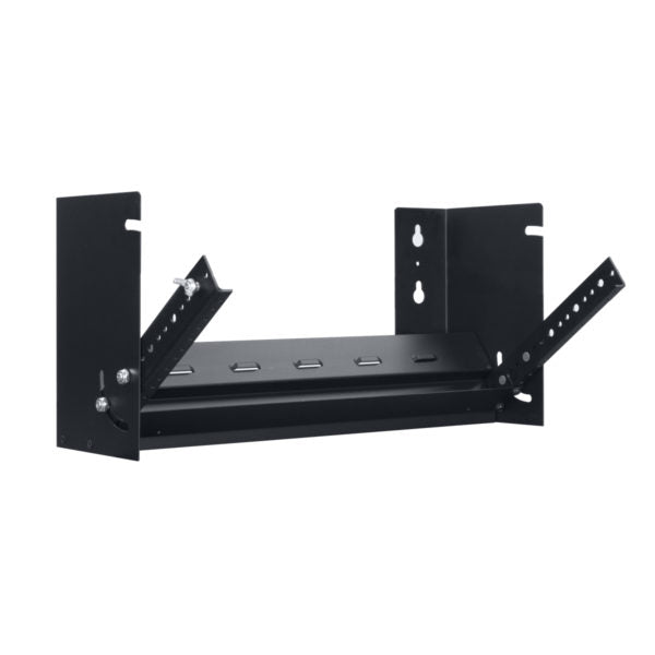 | Wall rack for networking is a great platform for voice/data equipment including patch panels, routers, hubs, and network switches. The hinged panel mounting frame pivots down 90 degrees, with an absolute stop, providing rear access to equipment for punch-down interconnects while in the fully open position. |