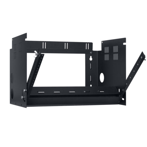 | Wall rack for networking is a great platform for voice/data equipment (patch panels, routers, hubs, network switches) to create a structured, organized cabling system. The hinged panel mounting frame pivots down 90 degrees, with an absolute stop, providing rear access to equipment for punch-down interconnects while in the fully open position. |