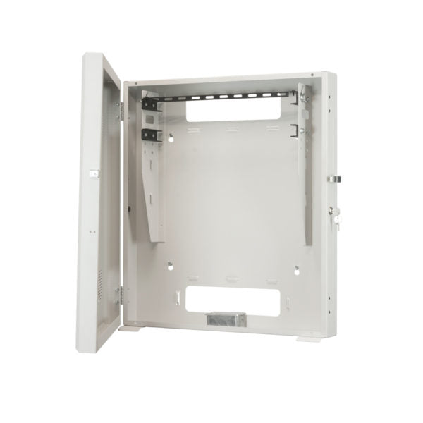 | Low profile wall-mount cabinet maximizes internal space with two mounting bays with separate rail sets. The 2U upper bay allows pivot-down access for a horizontally-mounted panel such as a shallow patch panel (not included). The 2U lower bay features rails to vertically-mount hubs, servers, or similar active equipment. |