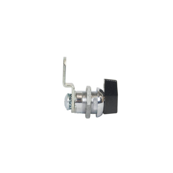 Thumb-turn cam latch replaces key lock cylinder for keyless entry to rack's rear door.