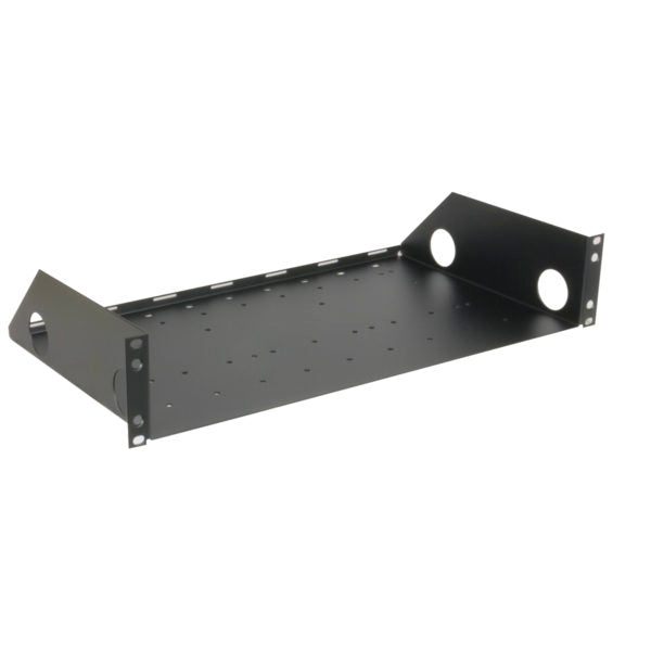 A special 19 inch rack mount utility shelf features a punched base designed to install screw-mount, chassis-style electronics. The shelf features a rear flange, cable lacing points, as well as a front security panel. |