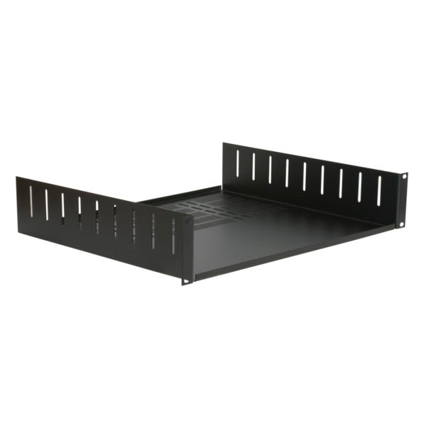 A 19 inch rack mount utility shelf with fully vented base for passive ventilation. In addition, the shelf has clamps to help keep equipment in place. |