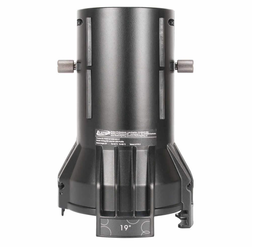 The Profile HD 19 Degree Lens is a high definition enhanced output lens designed to fit all Elation Profile ellipsoidal models. The lens features dual advanced fixed length aspheric lenses with a non-glare coating, and integrated 6.25" (159mm) gel frame holder (gel frame not included), and a rugged die-cast aluminum housing.