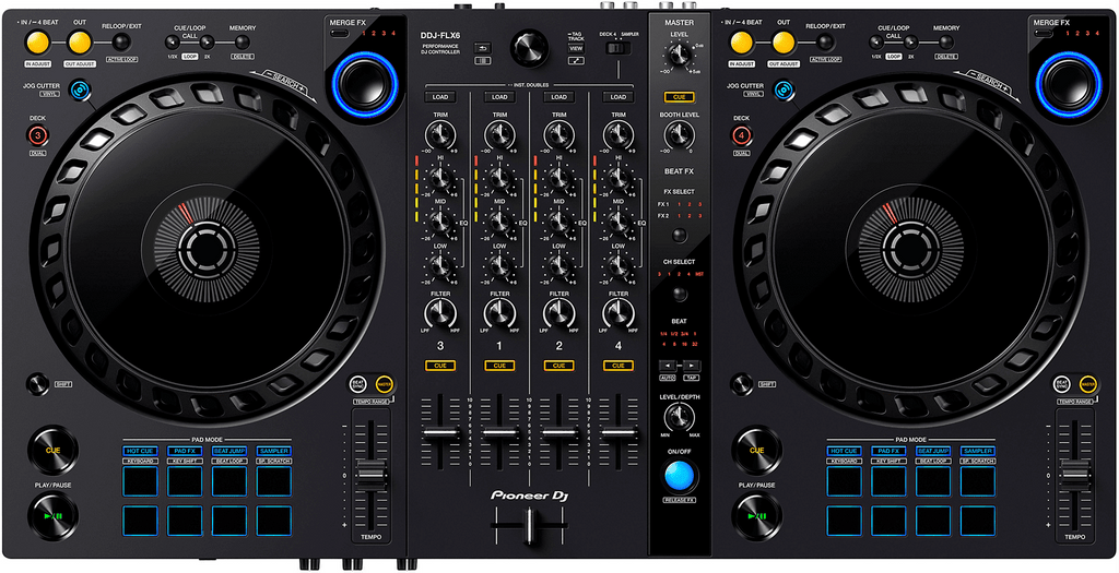 The layout of the controls on the DDJ-FLX6 is similar to Pioneer DJ's club-standard CDJ / DJM setup, so you can perform intuitively. However, the DDJ-FLX6 controller introduces a fresh look, with a high-quality dark-blue matte finish and redesigned jog wheels that will make your setup stand out.