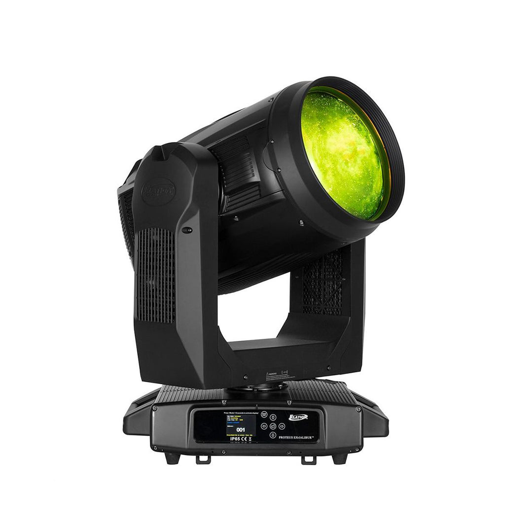 A wide array of gobos and prism overlays allow animating the sky, and with its incredible light intensity all CMY colors remain strong and vibrant even when fully saturated. Beam control is provided through a precise internal focus lens, providing crisp projection without optical errors. Dual variable frosts allow to soften the beam when required. A remote-controlled Expander lens allows widening the beam to approximately 3.5 degrees. The fixture is ideally suited for theme parks, cruise ships, outdoor special events, large scale shows and concerts, and any situation where a massive beam or very powerful prism and flower effects are required. With its compact size and low power consumption the PROTEUS EXCALIBUR can be utilized in almost any application.