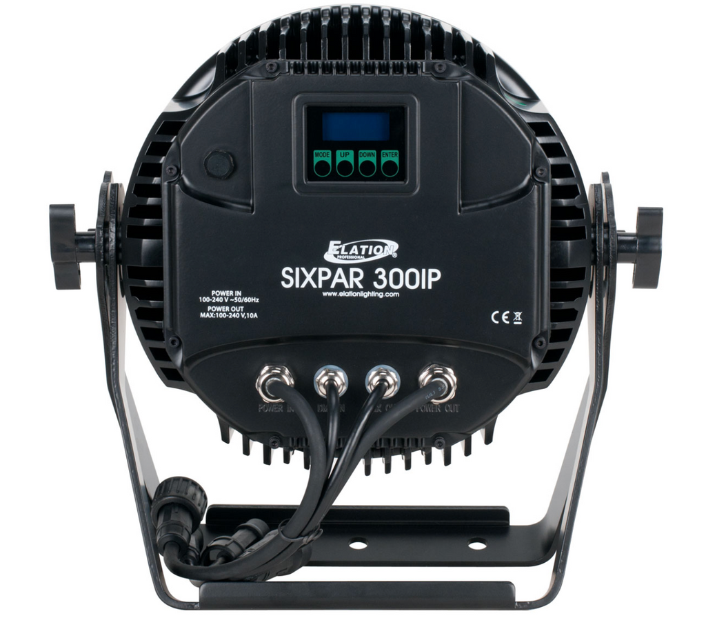 The IP65 rated SIXPAR 300IP™ features (18) 12W 6-IN-1 RGBAW+UV LEDs, 15° beam and 25° field angles, electronic strobe and dimming (0-100%), 5 variable dimming curve modes, dual yoke / floor stand, multiple unit power linking, RDM (remote device management), rugged die-cast aluminum exterior, flicker free operation for TV and FILM, and a multi-voltage universal auto switching power supply (110-250v).